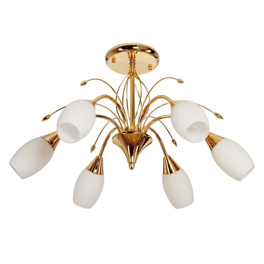 Потолочный светильник 12121/6AB MK от бренда ЭкономСвет. Каркас выполнен из материала металл, цвет золото. Плафоны (светорассеиватели) выполнены из материала стекло, цвет белый. Цоколь E14 рассчитан на лампы максимальной мощности до 40 Вт, а максимальная площадь освещения составит до 13 м?.